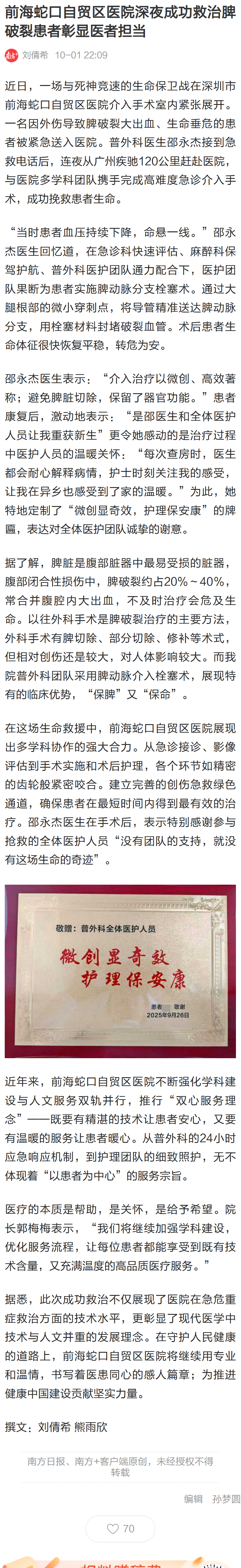 前海蛇口自贸区医院深夜成功救治脾破裂患者 彰显医者担当(转自南方Plus20251001)
