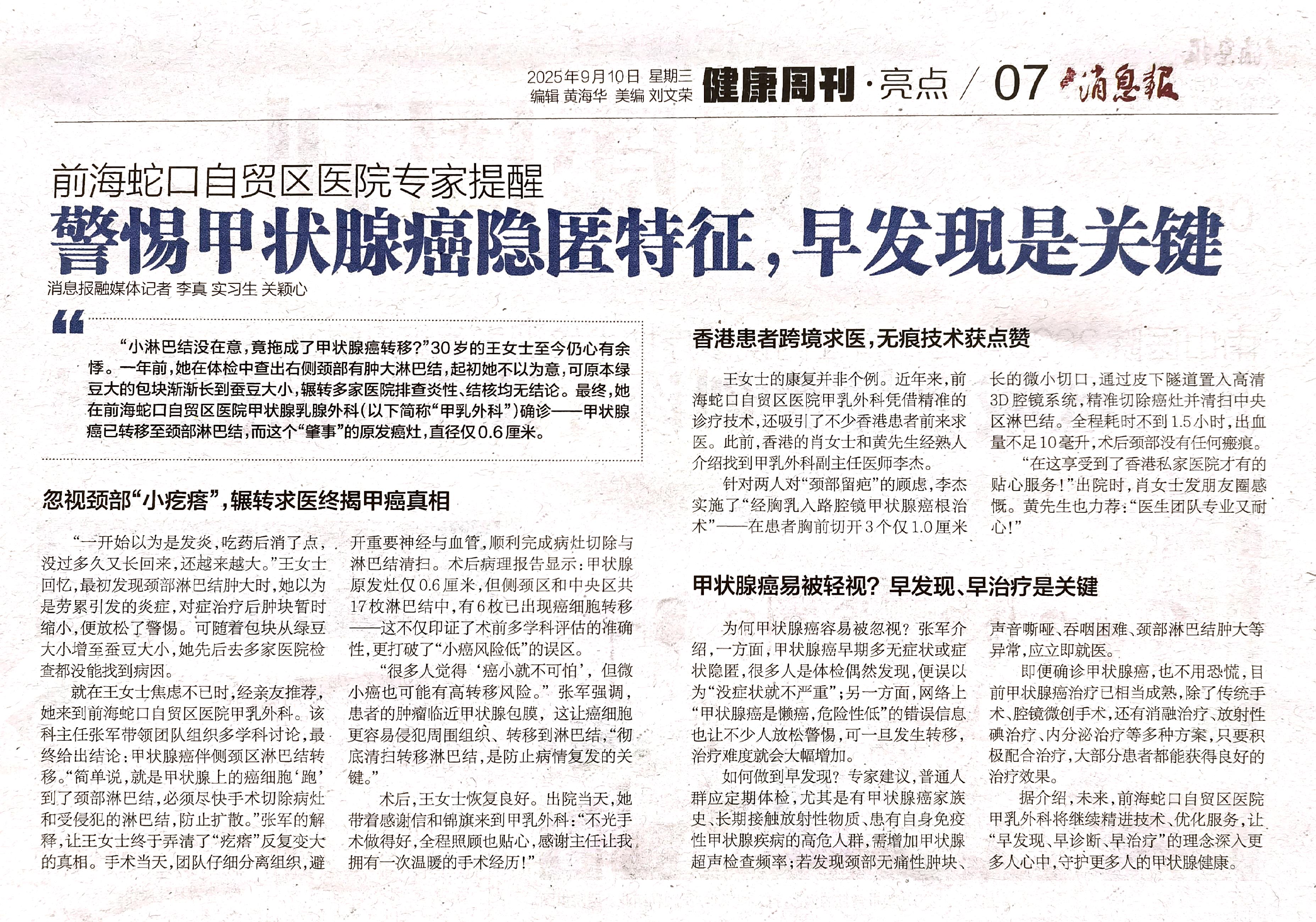 前海蛇口自贸区医院专家提醒 警惕甲状腺癌隐匿特征 早发现是关键(转自蛇口消息报20250910期A07版)