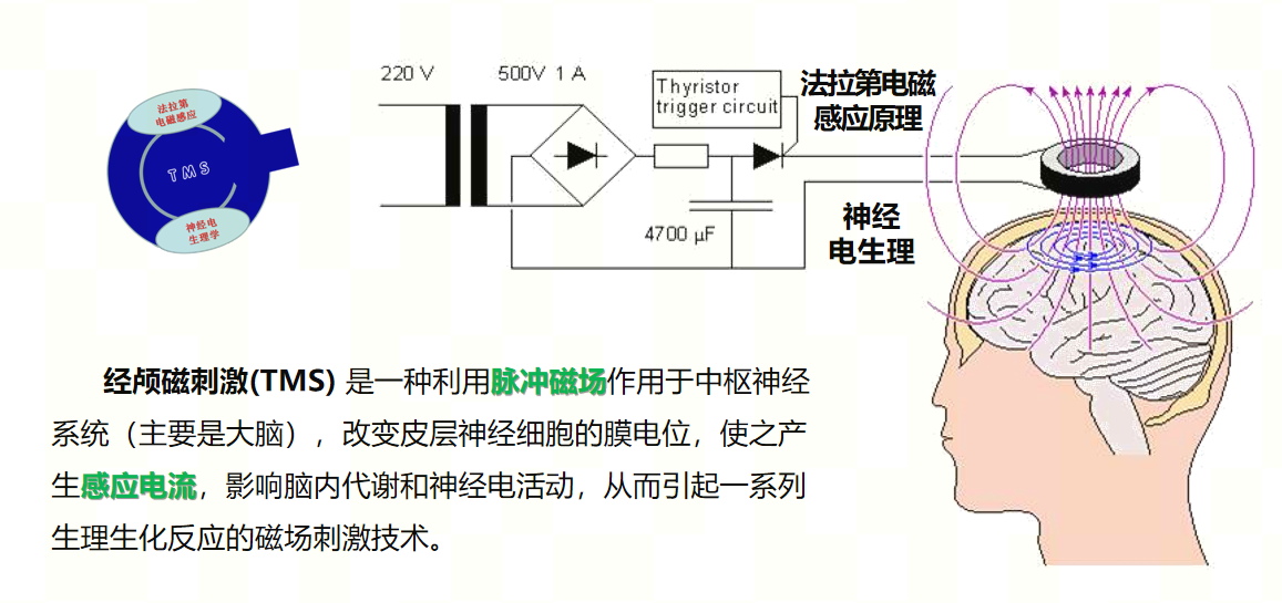 经颅磁刺激(TMS)技术是一种利用时变的脉冲磁场无穿透颅骨,作用于中枢神经系统,产生感应电流,引起一系列生理生化反应,从而影响脑内代谢和神经元兴奋性,起到治疗精神疾病和神经系统疾病作用的新型治疗手段。适应症:脑卒中继发功能障碍(如运动障碍、认知障碍、言语障碍、吞咽障碍、偏侧忽视等);睡眠障碍;耳鸣(非器质性);帕金森病;神经性疼痛;纤维肌骨痛;阿尔兹海默症;焦虑、抑郁症、BANNED WORD症、多发硬化症下肢痉挛。