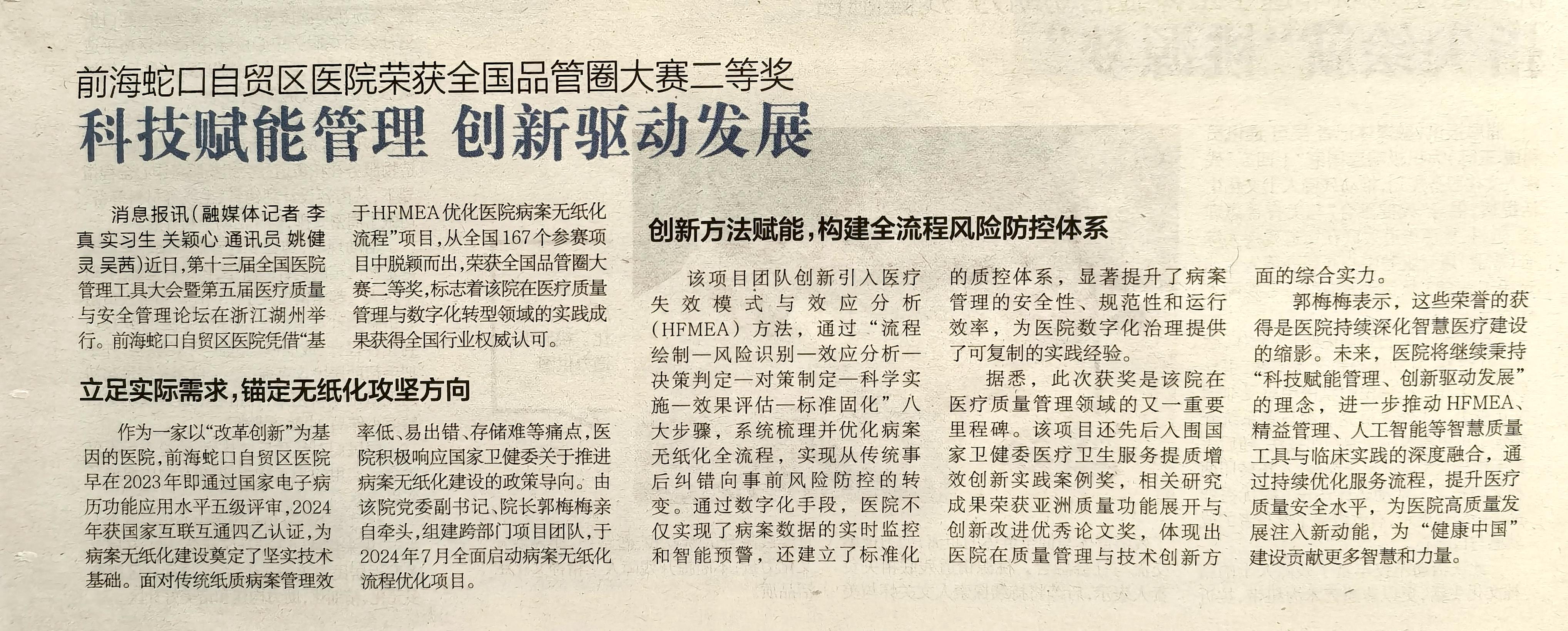 前海蛇口自贸区医院荣获全国品管圈大赛二等奖 科技赋能管理 创新驱动发展(转自蛇口消息报20251112期A06版)