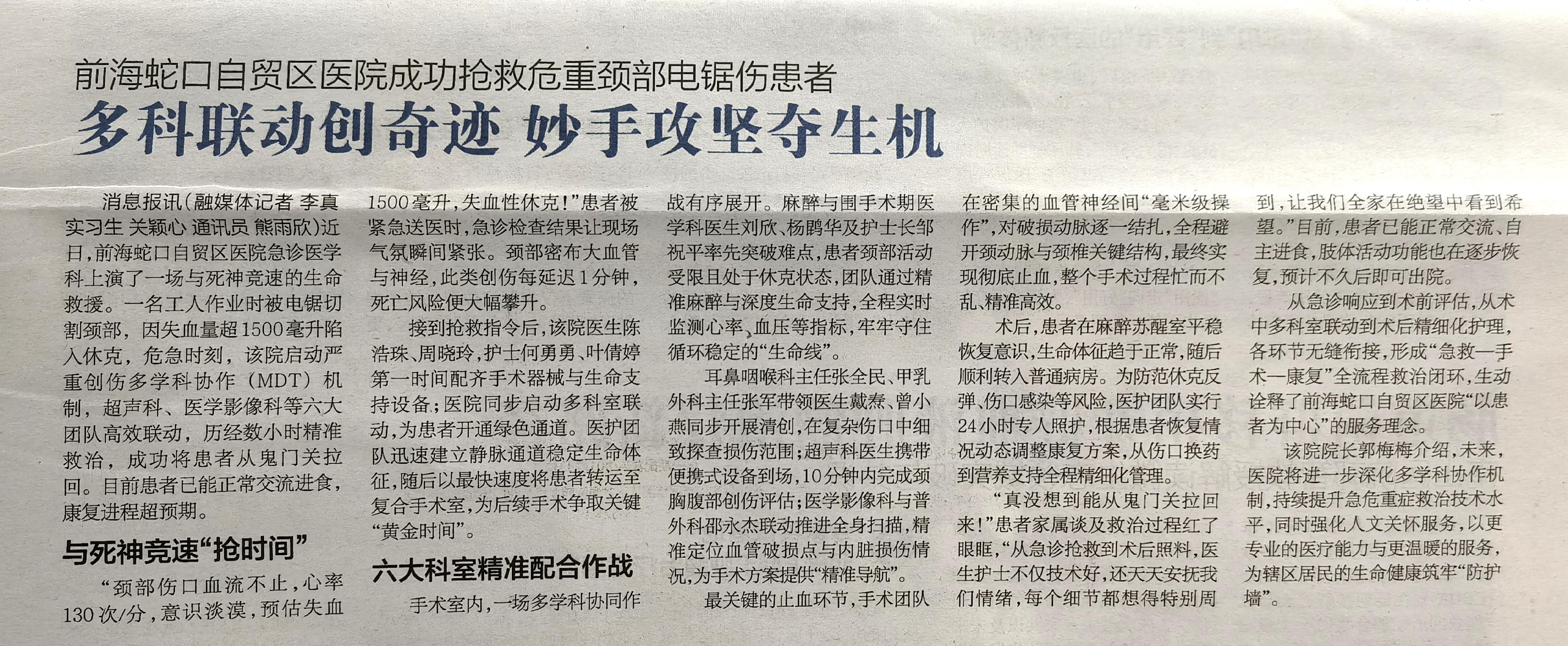 前海蛇口自贸区医院成功抢救危重颈部电锯伤患者 多科联动创奇迹妙手攻坚夺生机(转自蛇口消息报20251203期A07版)