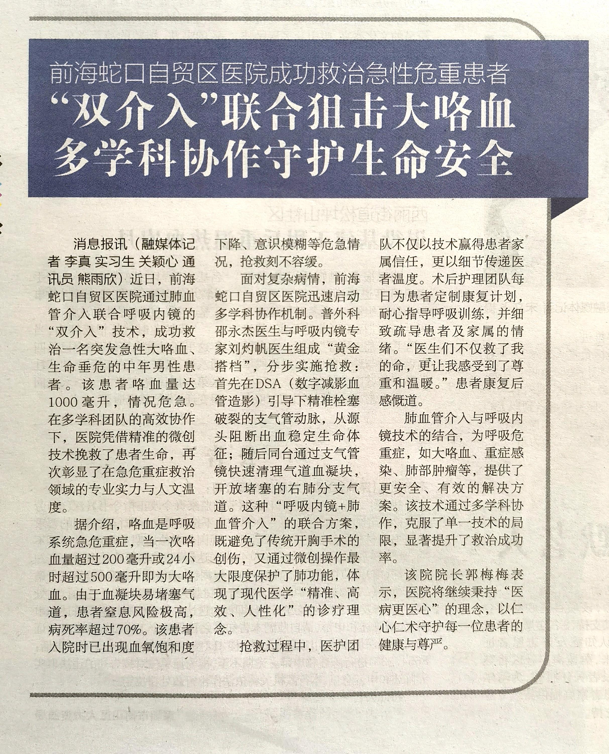 前海蛇口自贸区医院成功救治急性危重患者 “双介入”联合狙击大咯血 多学科协作守护生命安全(转自蛇口消息报20251210期A06版)