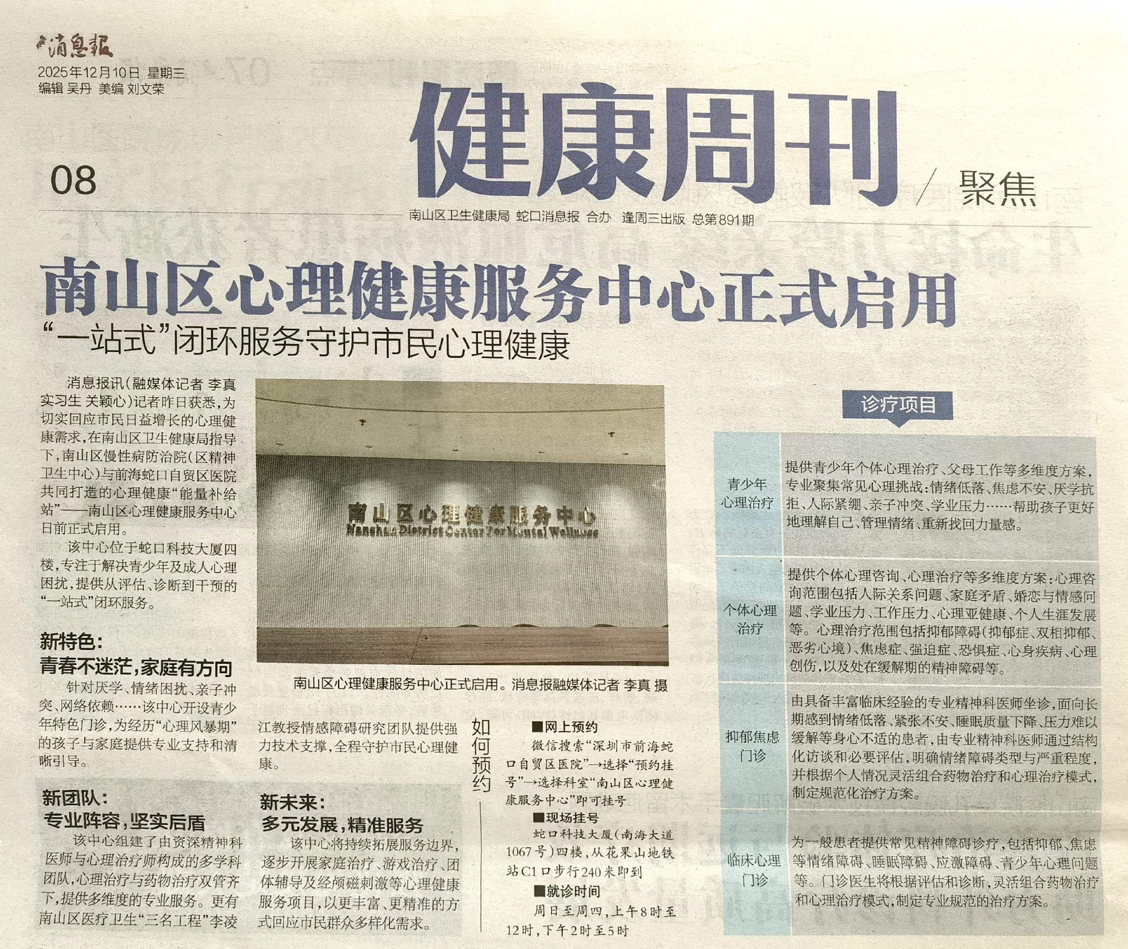 南山区心理健康服务中心正式启用 “一站式”闭环服务 守护市民心理健康(转自蛇口消息报20251210期A08版)
