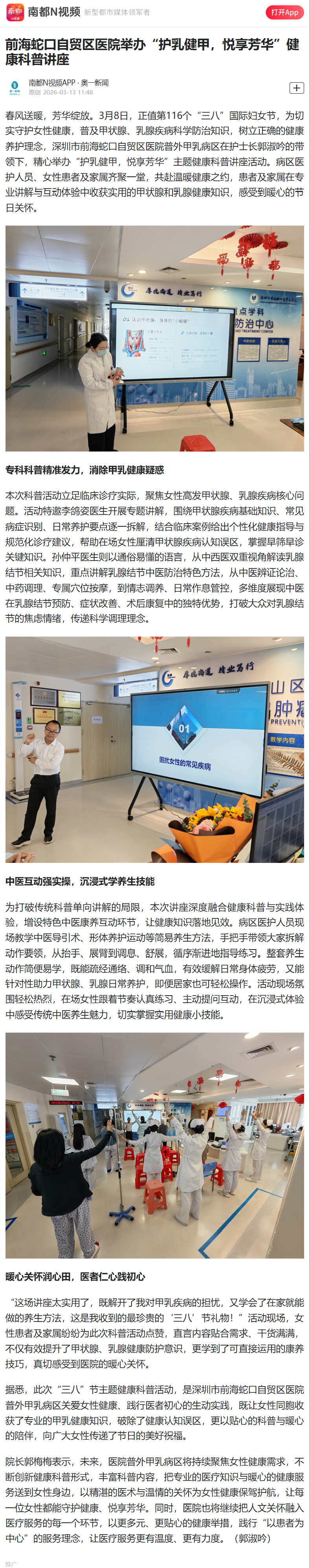 前海蛇口自贸区医院举办“护乳健甲,悦享芳华”健康科普讲座(转自南都N视频·奥一新闻20260313)