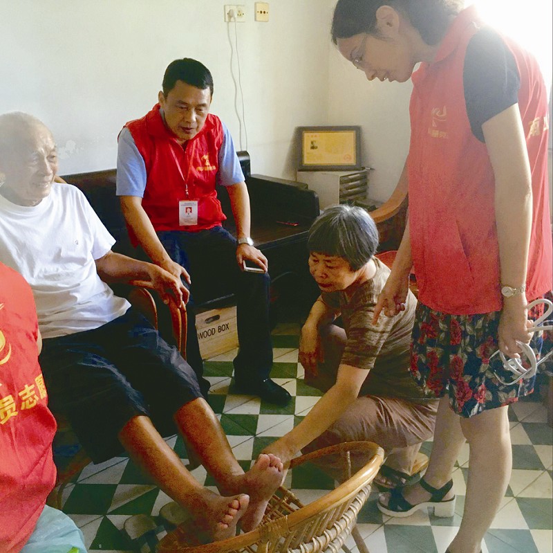 黄勇跃向朱醒帆同志女儿详细询问了老人的身体情况、生活起居及活动状况,社康人员为他和老伴量血压、测血糖和检查基本体格,又检查老人双下肢水肿情况。黄勇跃夸赞两位老人身体状况保持良好,子女照顾有方,并嘱咐若有医疗保健需求,赤湾社康和蛇口医院会全力帮助解决。老人听后非常高兴和感动。