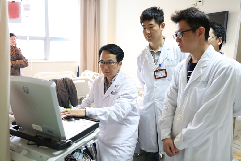 在完成系统理论学习后,李江亲自示范,对多位住院典型、疑难的患者进行床旁心脏彩超检查,其中包括先天性心脏病、动脉导管未闭、心梗后室壁瘤形成、严重心力衰竭等,并指出患者超声特点,从而迅速及正确地获得临床诊断。通过床旁耐心指导心内科医师完成超声心动图检查,快速提高心内科医师心脏彩超诊疗水平。
