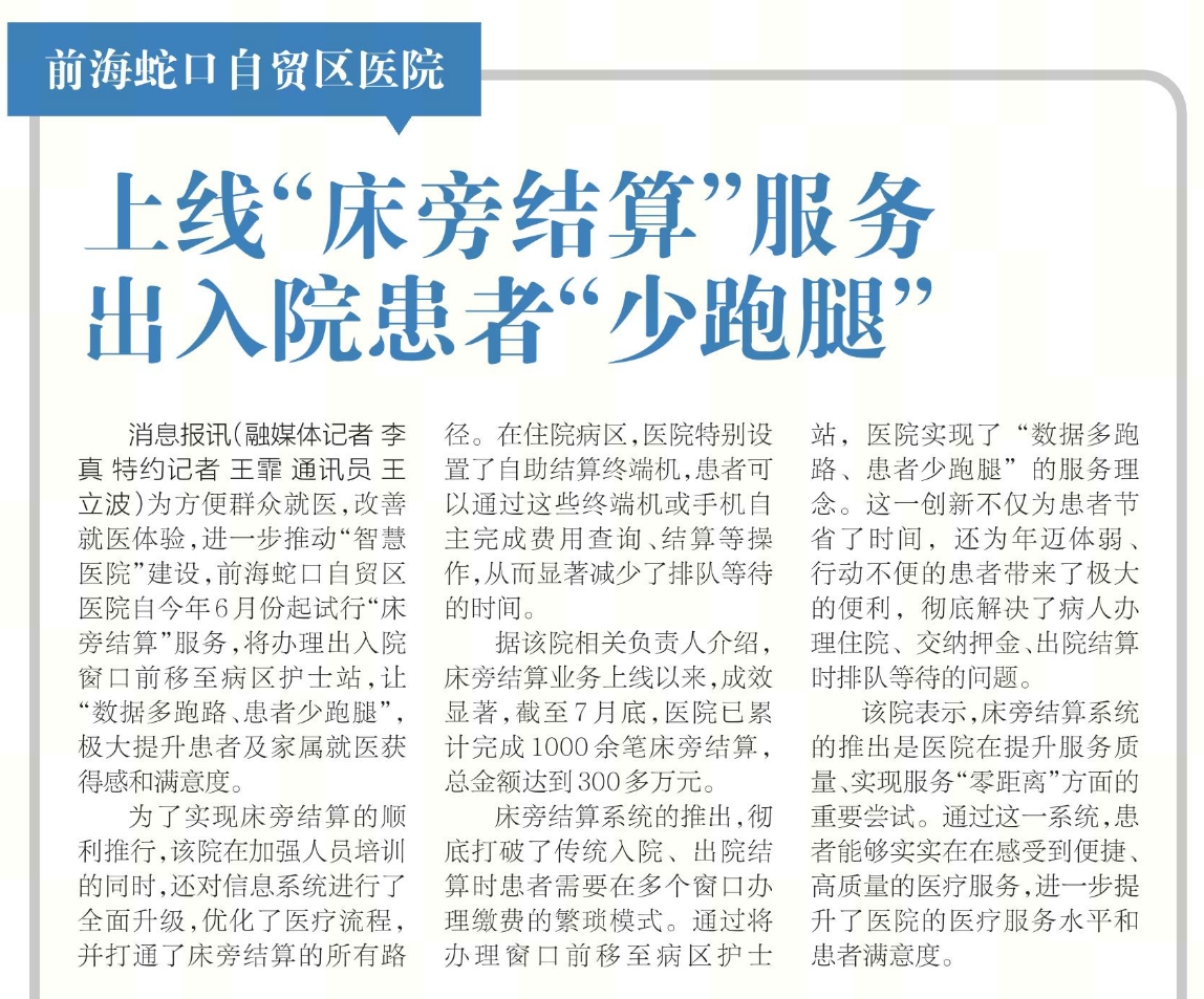 前海蛇口自贸区医院上线“床旁结算”服务 出入院患老“少跑腿”(转自蛇口消息报20240814期A06版)