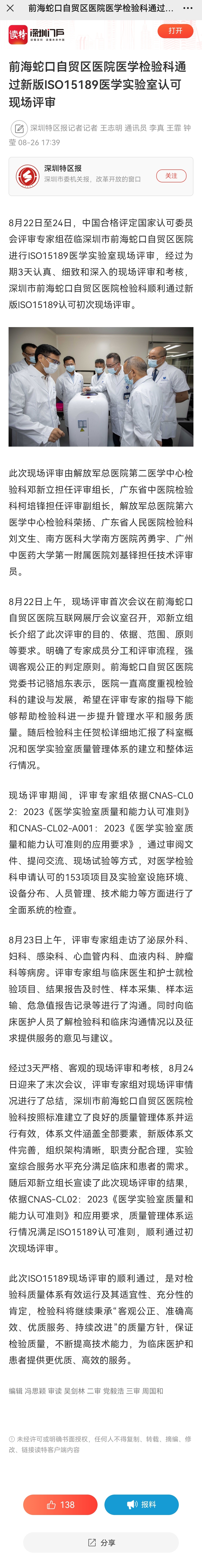前海蛇口自贸区医院医学检验科通过新版ISO15189医学实验室认可现场评审(转自读特网20240826)